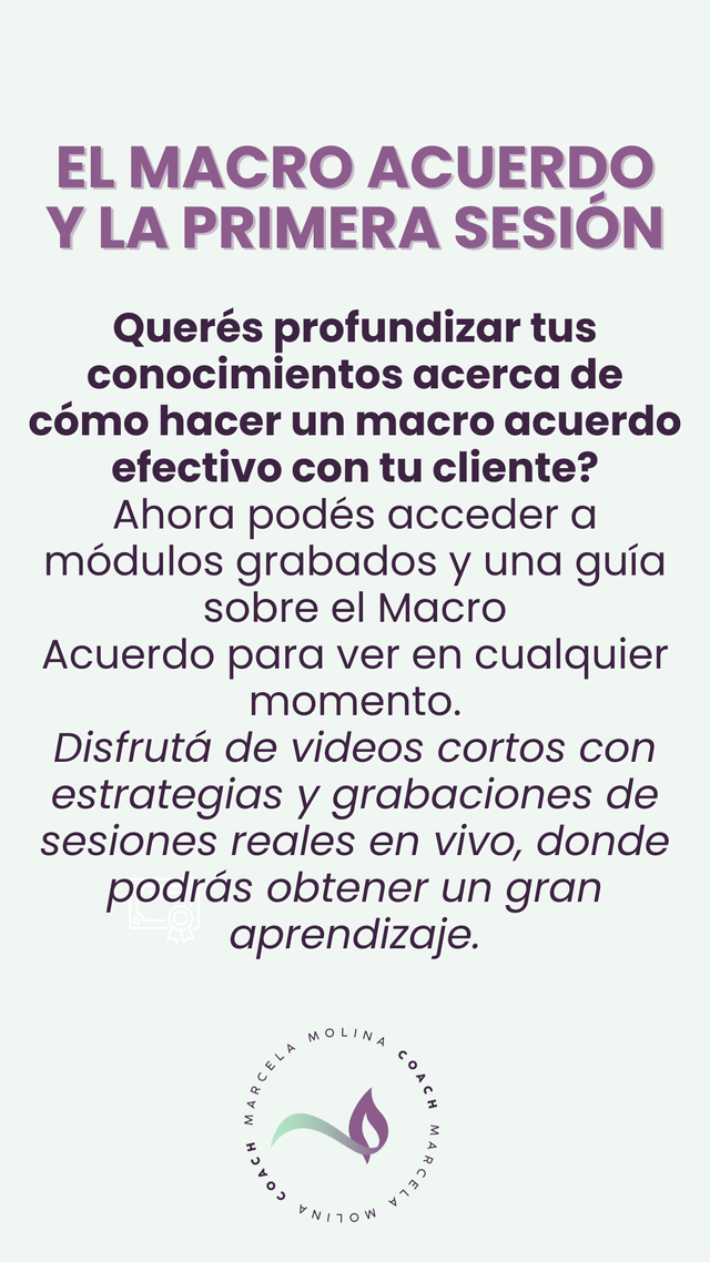 Videos cortos.Un proceso real, primer encuentro y primera sesión con cliente real. Recibiras material de lectura para desplegar tus habilidades en el Macro Acuerdo, estas a un paso de procesos efectivos como coach.